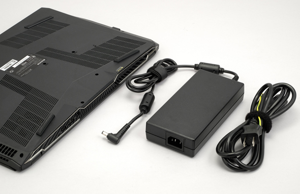 ACアダプターの出力仕様は、230ワット(19.5ボルト/11.8アンペア)。サイズは、突起部をのぞいた実測値で84(幅)×170(奥行き)×35(高さ)ミリ、重量は約900グラム(電源ケーブル込)だ