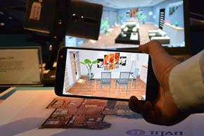 ブースの最も奥には、Googleの「Tango」に対応する世界初のスマートフォン「Phab 2 Pro」のコーナーを設置。「Tango」対応のインテリアシュミレーターアプリを使って、広いスペースに3Dの家具を配置するAR体験ができるようになっていた