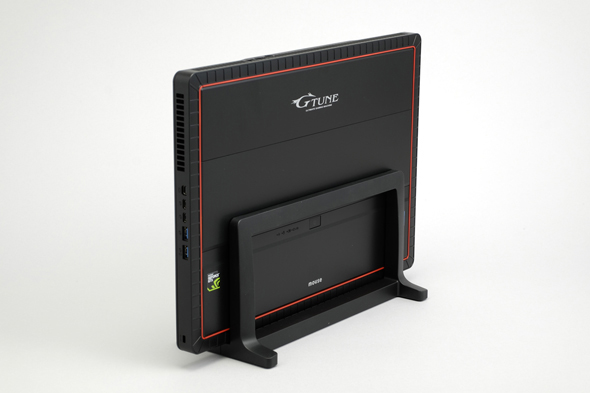 スタンドにはロゴが正常に見える向きに置くと通気口のある面が上部に来て放熱面で理想的なレイアウトとなる。付属のスタンドはフレームタイプだが、見た目の印象以上に重さがあるしっかりした作りで安定感も十分。少々の衝撃や振動で倒れてしまうことはないだろう