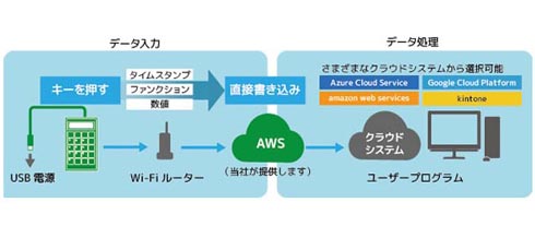 IEEE 802.11b/g/n接続に対応したテンキーパッドで、入力したデータを本製品単体クラウドサーバに直接書き込めるのが特徴。また本体側に1500件分の入力データを保存可能で、Wi-Fi接続が行われていなかった場合にも再接続時に保存データをまとめて送信できる。