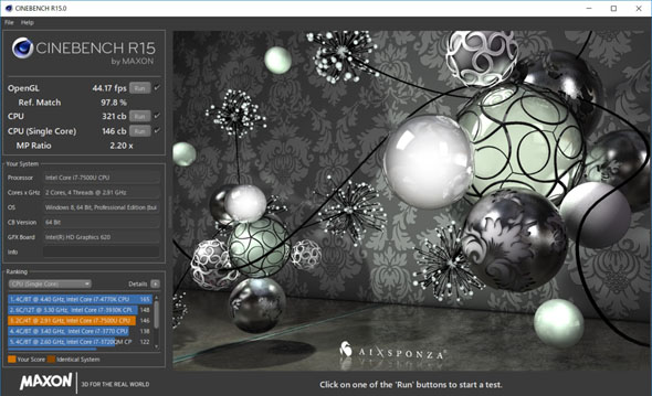 具体的にどのくらいのパフォーマンスがあるのか、ベンチマークテストで見てみよう。CPUの基本パフォーマンスの目安となるCINEBENCH R15のCPUスコアは325。Core i7-7500Uの性能をキッチリ発揮できている。ストレージテストの定番であるCrystalDiskMarkのスコアも、Serial ATA接続のSSDとしては悪くないスコアだ。