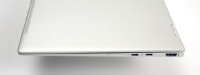 インタフェースは、Thunderbolt 3(USB 3.1 Type-C兼用)を2ポート装備する先進的な内容。給電仕様であるUSB PDにも対応しており、高速なデータ転送やディスプレイ出力(Thunderbolt 3、またはDisplay Port over USB Type-C)、PCの充電(ACアダプターの接続)、周辺機器(スマートフォンなど)への給電と、多用途をこなせる。これらの機能はどちらのポートでも対応しているので使い勝手が良い。