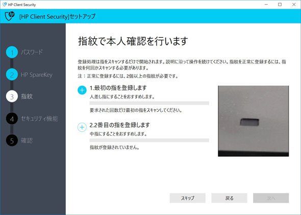 さらに、プリインストールされているオリジナルのセキュリティツール「HP Client Security Gen3」を使えば、より強力かつ便利なセキュリティ設定が簡単に行える。指紋に加えて、PINやBluetooth、FeliCaなどを組み合わせる「マルチファクタ認証」の他、電源投入時の認証設定、さらに電源投入時に再度認証操作をすることなくログインできる「ワンステップログオン」設定も可能だ。
