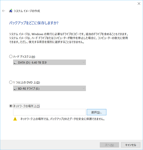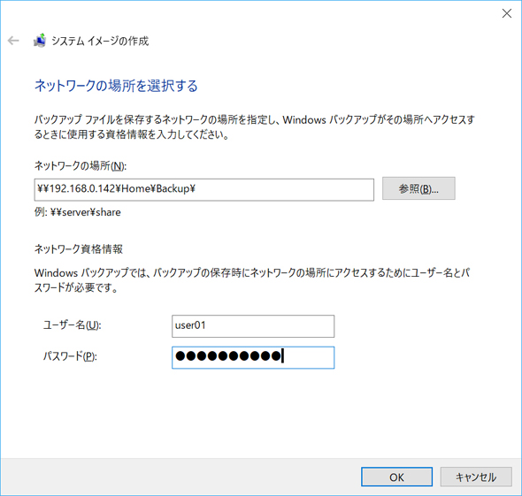 システムイメージはHDD、光学ディスク、ネットワークドライブのいずれかに作成できる。今回はASUSTOR NAS上に作成するので「ネットワークの場所上」を選び、「選択」ボタンをクリックする。「ネットワークの場所を選択する」ダイアログが表示されるので、ネットワークの場所にはASUSTOR NAS上のフォルダ、ユーザー名・パスワードにはASUSTOR NASにアクセスするときのユーザー名・パスワードを入力する。