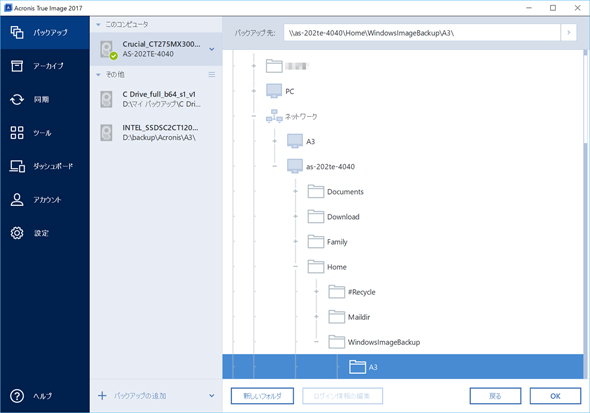 2台以上のディスクで構成されたシステムの場合はバックアップの対象を指定する。ユーザーデータは日々更新、作成されるのでシステムイメージに含めず、ASUSTOR Backup Planで定期的に取得する方がいいだろうまた、Windows標準のバックアップ機能以外に、市販のバックアップソフトでもASUSTOR NASを利用できるものは多い。高機能なバックアップ機能を利用したい場合は、市販ソフトの体験版できちんと動作するか確認しよう。