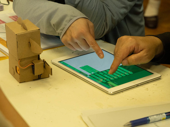 NTTドコモは12月5日、教育用プログラミングロボット「embot」(エムボット)を活用した教員向けの研修プログラムを世田谷区立 東玉川小学校で実施した。手のひらサイズの段ボールロボットが、これからプログラミング教育に取り組んでいく先生たちの注目の的となった。