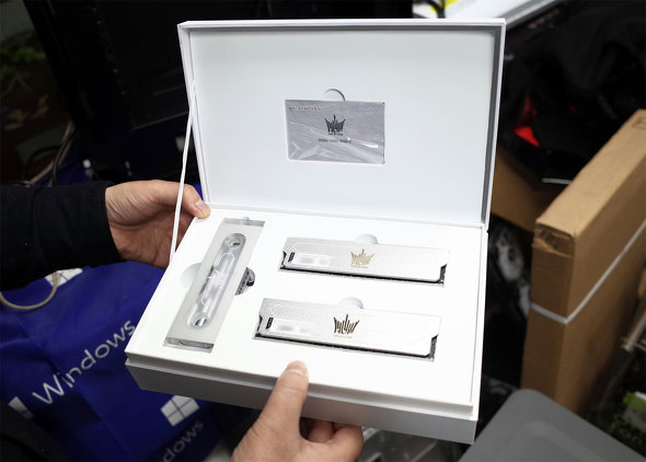 なお、DDR4メモリでも特殊な高級モデルが登場している。GALAXのDDR4-3200 8GB×2枚キット「HOF OC Lab Water Cooling WAZA duck Edition」で、価格は5万5000円前後だ。オーバークロッカーのduck氏が競技用に選別したメモリで、4本まで装着できるウォーターブロックも付属している。