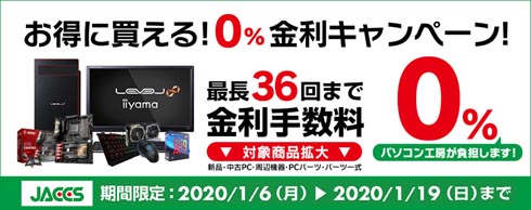 ユニットコムは1月6日、分割支払い時の金利手数料が最長36回まで無料になる「ショッピングローン0%金利キャンペーン」を開始した。実施期間は2020年1月19日まで。