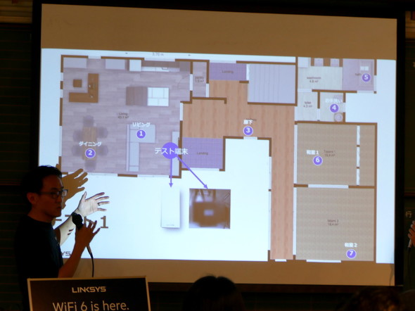 説明会の後半には、APeAシニアプロダクトマネージメントマネージャーのデビット・シャオ(David Shao)氏と、Linksysセールス&マーケティングマネージャーの八島史典氏が登壇し、一軒家(シャオ氏の自宅)でVelop MX5300とWi-Fi 6対応のiPhone 11を組み合わせた場合で、部屋ごとの通信環境について調べた結果を説明した。