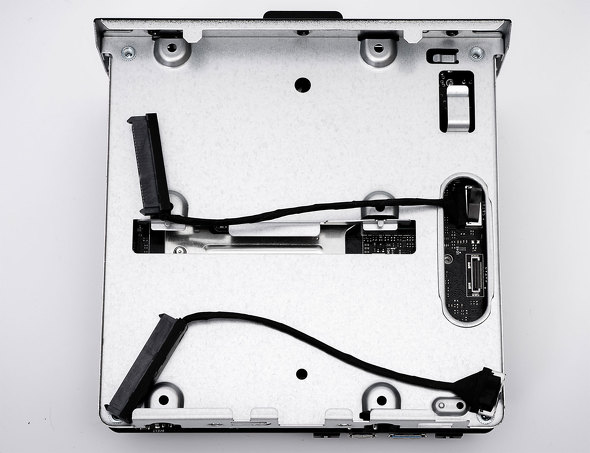 背面のネジを4つ外せばリアパネルと一体化したマザーボードが引き出せる。フロントの端子とつながる1本のケーブルを外せば、完全にカバーとマザーボードを分離して作業できる。このあたりは、従来の「DeskMini 310」シリーズと共通だ。
