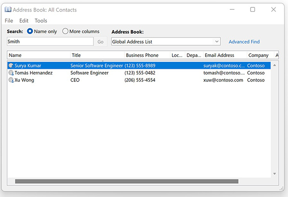 Microsoftによると、従来のアドレス帳でも検索文字列を入力する欄の上にあるラジオボタン「Name Only」を「More Columns」に切り替えれば(「Name Only」が標準設定)、ラストネームやメールアドレスなどでも検索可能なのだが、この事実がほとんど浸透していなかったという。