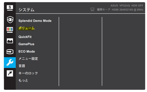 また、VP32UQとVP32AQにはスピーカーこそ付いているものの、音が若干こもりがちである。また、音量調整がOSDメニューの少し奥まった階層にあるため、サッとボリューム調整するのが難しい。「ショートカット」メニューにボリュームを登録すれば手数を大幅に減らせる。ただし、ショートカットの登録数は2つまで(標準では「入力選択」と「明るさ」)なので、どの機能を割り当てるかは環境次第といったところだろう。