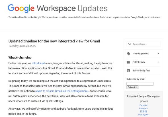 これまで、Google Workspaceのユーザーは、設定から有効にすれば利用できるオプトイン方式で提供されていた。今後は、標準で新UIが有効となり、設定から旧インタフェースを選択できるオプトアウト方式となる。また、Googleの個人アカウントも対象となった。
