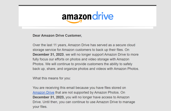 米Amazonが、クラウドストレージサービスAmazon Driveのサービスを2023年12月31日に終了するとして、ユーザーにメールで案内を送っている。終了に先立ち、2022年10月31日にモバイルアプリを各ストアから削除。Webからのアップロードも2023年1月31日に終了する。