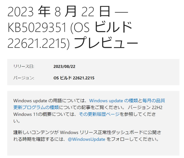 米Microsoftは8月22日(現地時間)、Windows向けに8月度の非セキュリティプレビュー更新プログラムをリリースした。対象となるのはWindows 11 22H2(KB5029351)、Windows 11 21H2(KB5029332)、Windows 10 22H2(KB5029331)。
