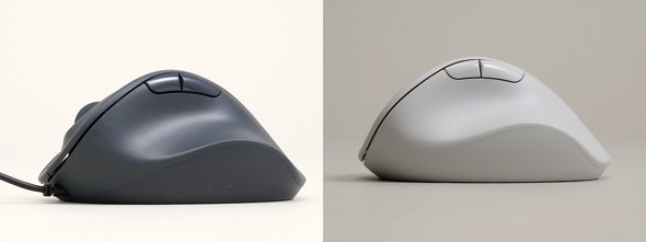 サイズにかかわらず、ボディーには、手首への負担を抑えるための絶妙な角度の傾斜が付いている。親指を添える部分が通常のマウスに比べて高くなっており、手を添えるだけでしっかりとホールドできる。