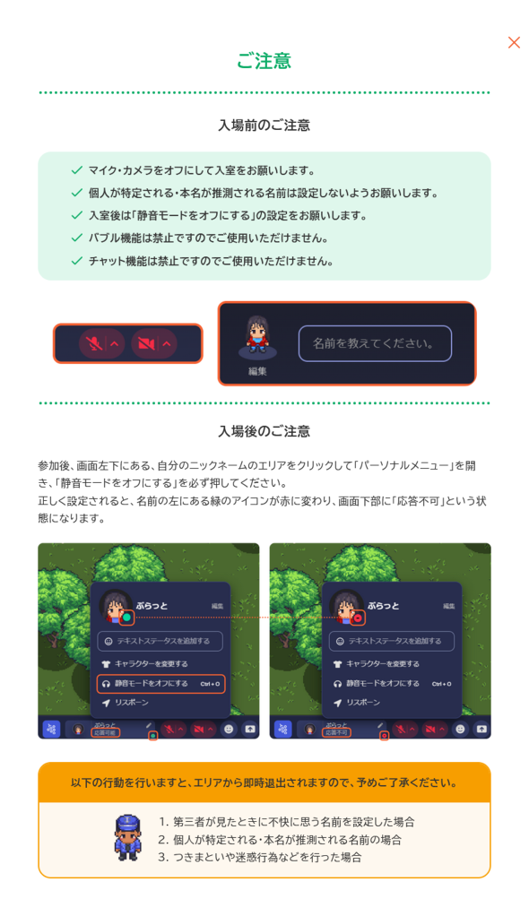 気を取り直してぷらっとば〜すへのログイン作業を進めると、入場前の設定項目や入場後の作業の説明、BANされる条件があれもこれもとズラリ並んでいます。ログインをさせたくないのではと感じるほどです。