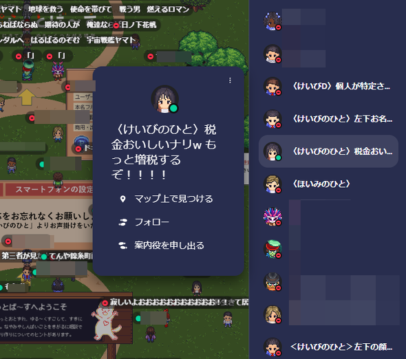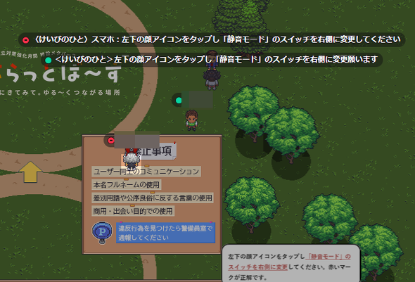 設定変更をしていないユーザーのアバターには「けいびのひと」アバターが寄っていって(1人のアバターに、2人の「けいびのひと」が付きまとい続けて)、設定変更のための案内をかたくなに見せつけてきます。頻繁に「設定を変更してください」といった音声アナウンスも流れます。