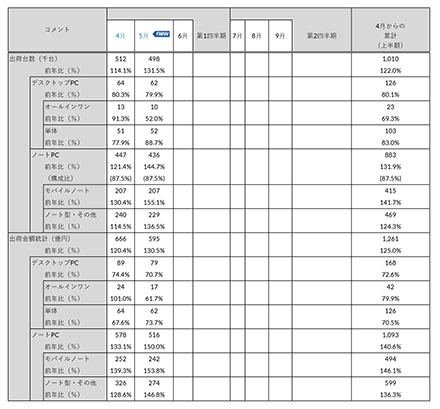 今回の資料によると、2024年5月の総出荷台数は前年比で131.5%となる498万台を記録。デスクトップPCは前年比79.9%と縮小傾向にあるものの、ノートPCの出荷が前年比144.7%と大幅に拡大したことが要因となっている。