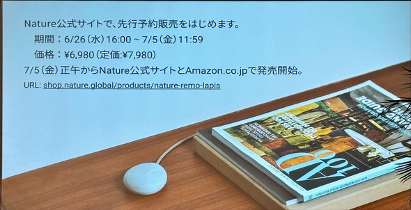 Natureは7月5日、新型のスマートリモコン「Nature Remo Lapis」を発売する。想定価格は7980円で、6月26日からNature公式サイトで予約販売を受け付けている。Amazon.co.jpでも7月5日から販売を開始する予定だ。