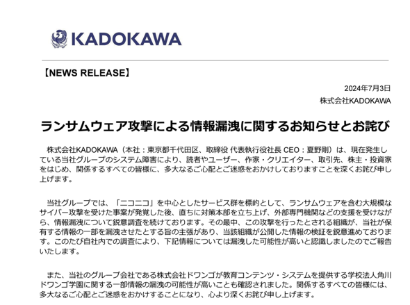 KADOKAWAは7月3日、同社グループに対するランサムウェアを含む大規模なサイバー攻撃に関し、外部漏えいした可能性が高いと認識した情報の種類を公開した。