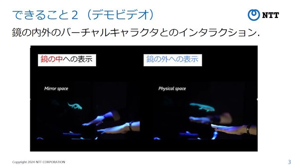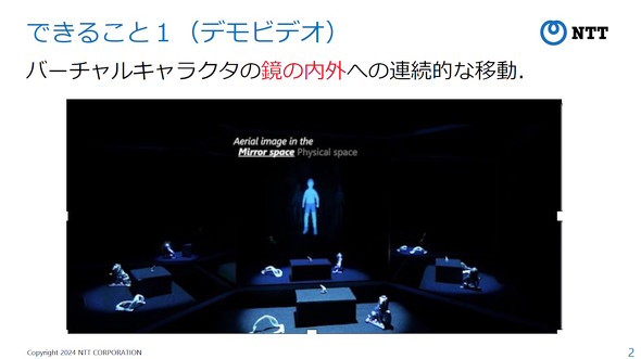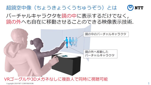 「超鏡空中像」はNTTによる造語で、バーチャルキャラクターを鏡の中に表示するだけでなく、鏡の外にも自在に移動させることができるという映像表示技術だ。