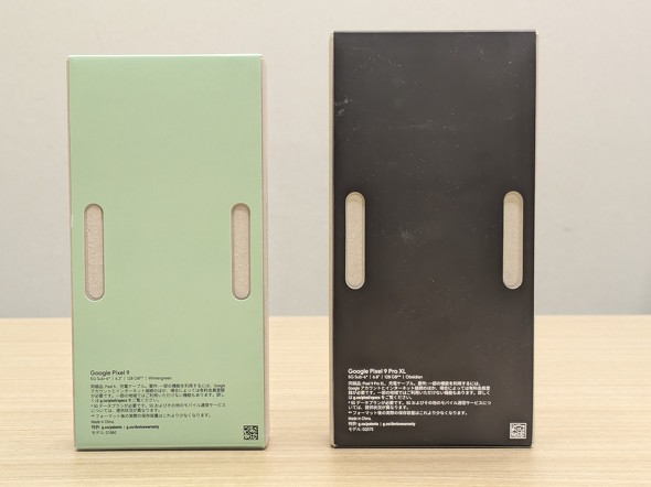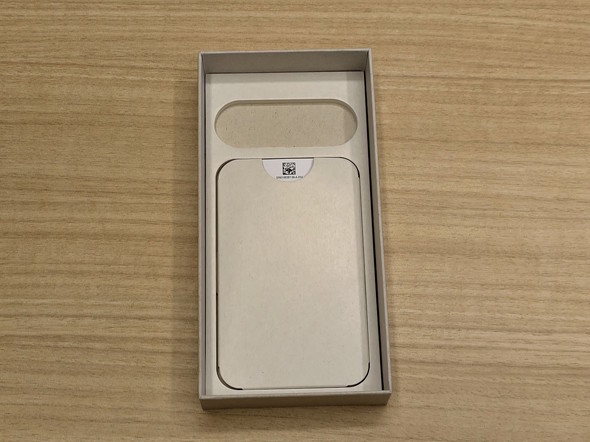 しかし、Pixel 9シリーズではパッケージのデザインが大きく変わった。すぐ分かる変更点としてパッケージがスリーブ付きになったことが挙げられる。スリーブは本体に合わせたカラーをまとっており、正面にはGoogleロゴと本体の写真があしらわれている。機種名はスリーブの底面側の印字、あるいはスリーブから顔をのぞかせている箱の印字で確認可能だ。