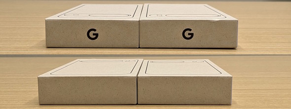 従来のPixelスマホのパッケージデザインは、2019年10月に発売された「Pixel 4」から大きく変わっていない。下箱底面(背面)の「#teampixel」の印字が簡略化されたり(写真付き→文字列のみ)、ACアダプターの別売化に伴いパッケージの薄型化が行われたりと、細かく見ると時代に合わせた変化も行われているのだが、正面からパッと見した印象に大きな差はなかった。