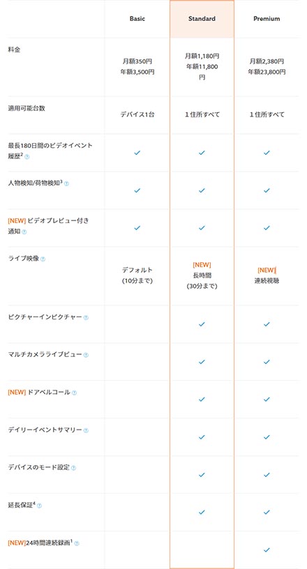 Ringブランド製デバイス向けのサブスクリプションサービスで、従来サービスから新機能を追加。訪問者によりドアベルが押された時に着信呼び出し画面が表示される「ドアベルコール」(対応:Ring Home Standard/Premium)や、24時間の連続録画機能(対応:Ring Home Premium)なども利用可能だ。