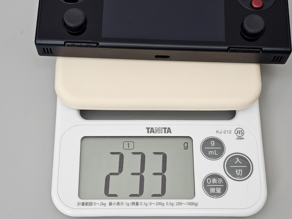 サイズはジョイスティックなどを除いた実測値で155(幅)×62(奥行き)×17(高さ)mm、質量は233gだった。大型ファンの搭載による厚みがあることや、コントロールパッドの搭載による幅など、一般的なスマートフォンと比べるのは難しいが、それでもポケットに入れておきやすい「MICRO」サイズのAndroidゲーム機だといえよう。