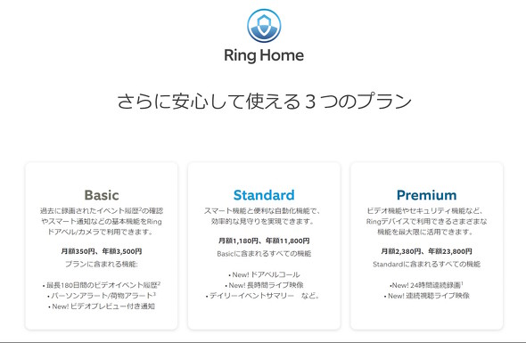 Ringの現行のサブスクリプションサービス「Ringプロテクトプラン」には、月額350円または年額3500円の「Basic」と、月額1180円または年額1万1800円の「Plus」の2種類がある。Basicプランはデバイス単位、Plusプランは住所単位での契約だ。