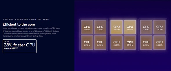 この買収の成果が結実したのが、2023年10月に発表されたPC向けにSoC「Snapdragon X Elite」で初採用されたCPUコア「Oryon」だ。OryonはNuviaが開発を進めてきたCPUコアがベースとなっており、先般発表されたスマートフォン向け新型SoC「Snapdragon 8 Elite」にも採用されることが決まっている。