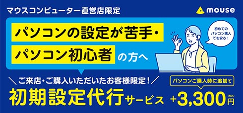 またマウスコンピューターは、同社製の即納品PCを購入する際にWindows OSの初回設定とアップデートを代行して実施する「初期設定代行サービス」を発表、同社直営ダイレクトショップ(仙台ダイレクトショップ、秋葉原ダイレクトショップ、新宿ダイレクトショップ、名古屋ダイレクトショップ、福岡ダイレクトショップ、大阪ダイレクトショップ、G-Tune:Garage 大阪)で開始した。利用料金は3300円だ(税込み)。