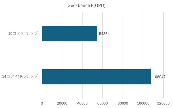 GPUテストの結果を過去のサンプルデータと比べると、M4 Proチップの20コアGPUは60コアGPU備えるM2 Ultraチップに迫るスコアを記録している。3分の1のGPUコアで、現状の「Mac Studio」の最上位構成とほぼ同じパフォーマンスということだ。