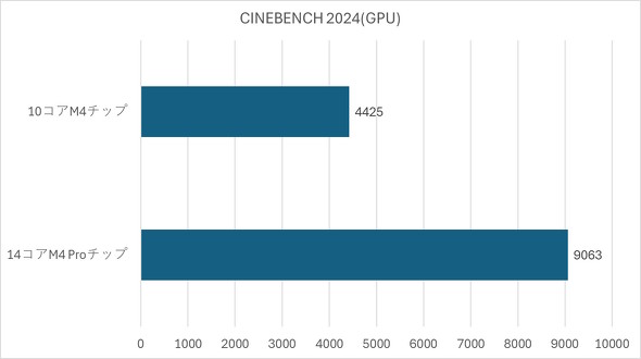 GPUコアを20基搭載している14コアM4 Proチップは、演算スループットだけ見るとM1 Maxチップとほぼ同等となる。ただし、Geekbench 6とCINEBENCH 2024のGPUテストは純粋に演算性能を比較しているだけなので、M4ファミリーにおける新しいハードウェアアクセラレーターの効果は見えない。