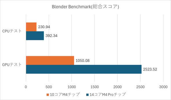 Geekbenck 6にプリセットされたGPUのマルチコアスコアの比較表。10コアM4チップ(左)の2倍のGPUコアを備える12コアM2 Maxチップ(右)は、性能もそのまま2倍になっている。このグラフでは、旧世代のApple Siliconとの演算性能差は分かるのだが、新しいハードウェアアクセラレーターの効果は大きいGPUのハードウェアアクセラレーターの効果は、Blender BenchmarkのGPUテストでいかんなく発揮された。併せて実施したCPUテストも含めたスコアは以下の通りだ。