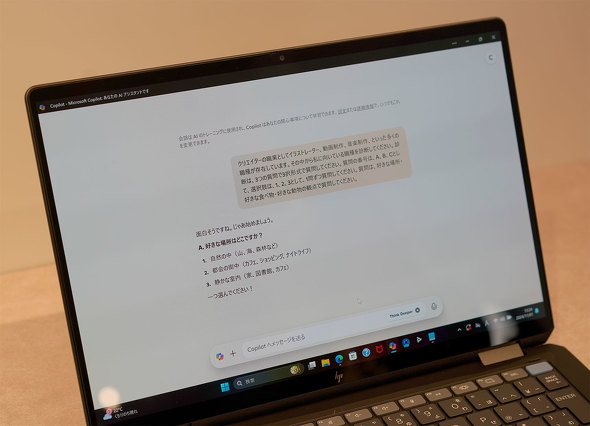 会場にあるPCは、いずれも同社のノートPC「HP Envy x360 14(Intel)」や「HP OmniBook Ultra 14(AMD)」といった最新の「新しいAI PC(Copilot+ PC)」で、きちんとCopilotキーが用意されている。このCopilotキーがAI体験への入口であり、Copilotと対話していくことになる。