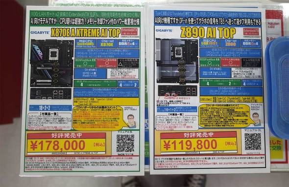 AMD X870Eチップセットを搭載する「X870E AORUS XTREME AI TOP」と、Intel Z890チップセット搭載の「Z890 AI TOP」で、価格は17万8000円前後と12万円前後となる。