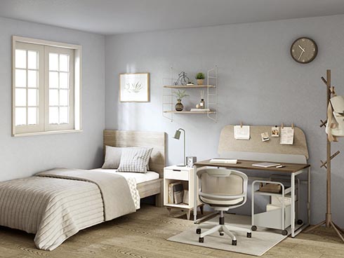 身体の発達が早い子どもの利用を想定した家具で、デスクの高さやチェアの座面の高さや奥行きなどの調整に対応。デスクは工具を用いず高さを変えられるラチェット方式を採用した。