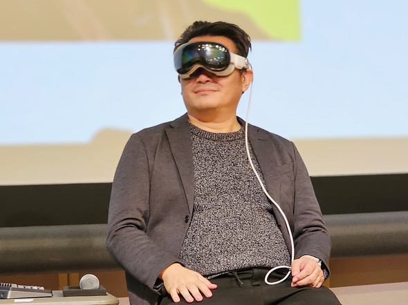 「名だたるゲストが……」と思っていたところ、登壇者全員がApple Vision Proを装着しているという異様な光景に会場はざわついた。村上氏はひっきりなしに右手の人差し指と親指で作った輪を上下に動かしているし、暦本氏も清水氏も、両腕を左右に広げたり、上げ下げしたりと挙動不審だ。