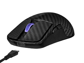 カーボンファイバー素材を用いた重量47gの軽量筐体を採用するゲーミングマウスで、最大4万2000DPIを実現する“ROG 100M Optical Microスイッチ”を採用。ポーリングレートはデフォルトで1000Hz/USBアダプターの「ROGポーリングレートブースター」利用時で最大8000Hzとなっている。