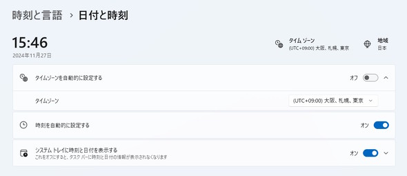 管理者権限のあるアカウントの場合、画像の通り設定から「日付と時刻」を表示できるのだが、管理者権限のないアカウントでは非表示となってしまう。ポリシーによって禁止されていない限り、時刻やタイムゾーンの設定は管理者権限がなくても可能なので、修正されるまでは代替手段で対応したい本バージョンに「eSCL(eScanner Communication Language)プロトコル」を使うUSBスキャナ(複合機を含む)を接続すると、当該デバイスを認識できない場合がある。別のプロトコルで接続できる場合は、eSCLを利用しないように設定することで問題を回避可能だ(デバイスドライバのインストールを別途求められる場合がある)。