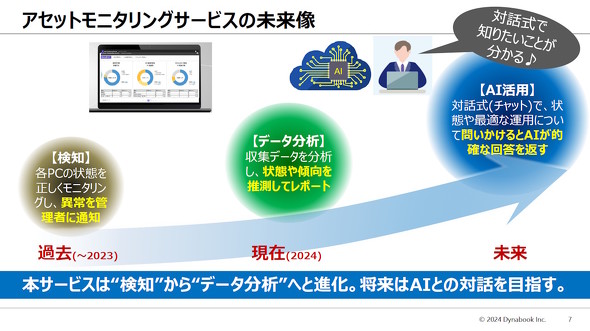Dynabookは11月29日、法人向けに提供している「PCアセットモニタリングサービス」の機能を拡充し、PCの不調やスペック不足について分析できる機能を実装した。サービスの標準提供料金は据え置きで、以下の通りとなる(1年単位の契約)。