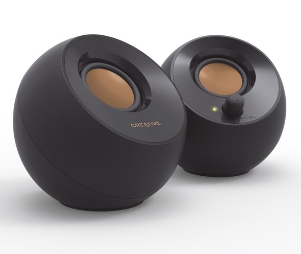 Creative Pebble V2は、コンパクトでスタイリッシュなUSB電源採用のアクティブスピーカーです。球体を模したミニマルなフォルムが特徴的で、45度上向きに配置されたドライバーにより、リスニングポジションに直接音を届けてクリアな音質と広がりのある音場を実現するといいます。