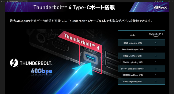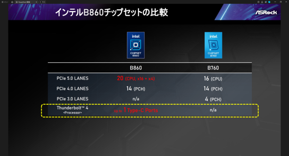 先代のB760から、PCIe 5.0のレーン追加とThunderbolt 4のサポートが加わっており、今回発表されたB860シリーズの主要モデルも、Thunderbolt 4対応のUSB Type-C端子を標準装備する。