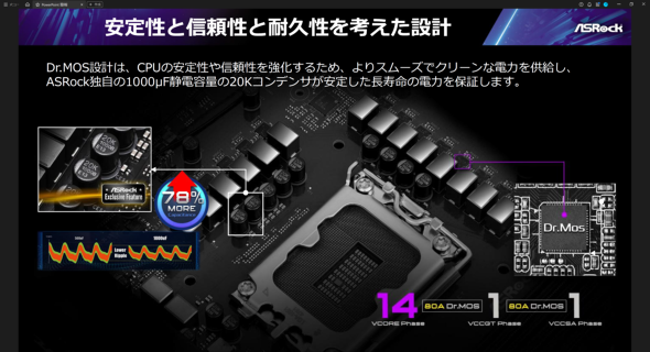 部品メーカーとの共同開発によるASRock独自の高耐久大容量コンデンサーを採用している。105度の高温環境で2万時間と長寿命かつ、同サイズで2倍の容量を実現したことから実装点数も減らすことができ、(高い品質を担保した上での)コスト減、故障確率の減少にも貢献しているという