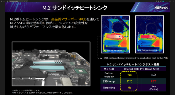 さらに、組み立てやメンテナンスのしやすさに配慮した要素として、グラフィックスカードのリリース機構を大型化した「Lite Release」、ツールレスでM.2 SSDを着脱できる「Toolless M.2 HeatSink+M.2 Latch」、SSDの熱を基板に逃がす「M.2 サンドイッチヒートシンク」、CPU無しでUEFI(BIOS)を更新できる「BIOS FlashBack」といった機能も積極的に盛り込んでいる。