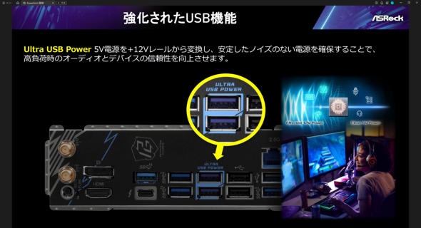 上位製品が備える高品質なUSB端子「Utra USB Power」。USBの+5V電流を+12V系電流からマザーボード上で生成することで、ノイズの少ない安定した電流を供給できるため、オーディオ系ユーザーからも需要があるというCopyright © ITmedia, Inc. All Rights Reserved.