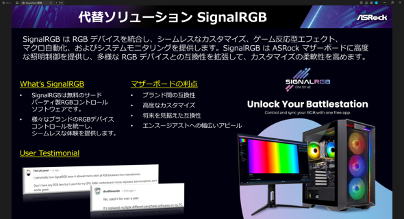新しい試みとしてサードパーティーのRGB LED制御ソフト「Signal RGB」とも提携する。動作検証情報の提供や完全互換性を目指して取り組んでいくという。