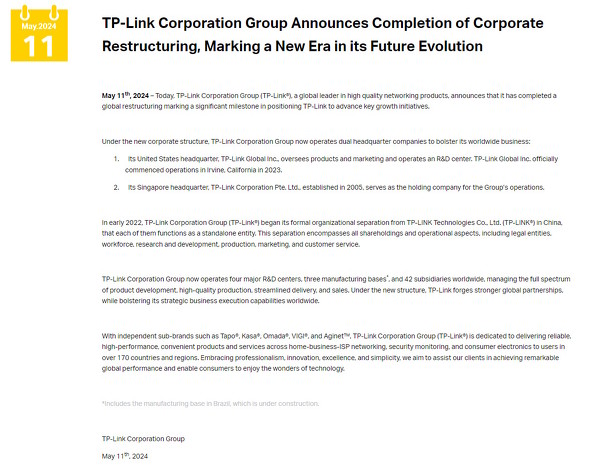そして2022年、TP-LINKは海外(中国外)事業の“完全分離”(スピンオフ)を開始する。時系列で記すと以下の通りだ。